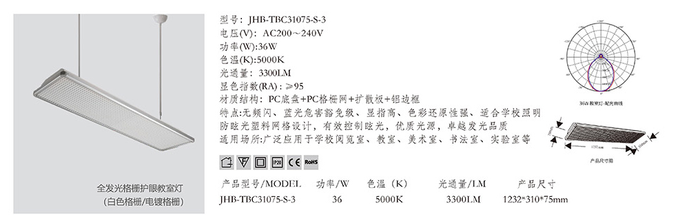 • 型号:JHB-T8C12-TS 功率:36W 电压(V):AC200~240V 色温(K):5000K 产品尺寸:对应产品型号 光束角:白色网93度、银色网100度 显色指数(Ra):≥95 灯珠数量:对应产品型号 材质结构:灯盘底座+灯管+防眩格栅 特点:散热性能好、显指高、光效高、无频闪、光斑均匀